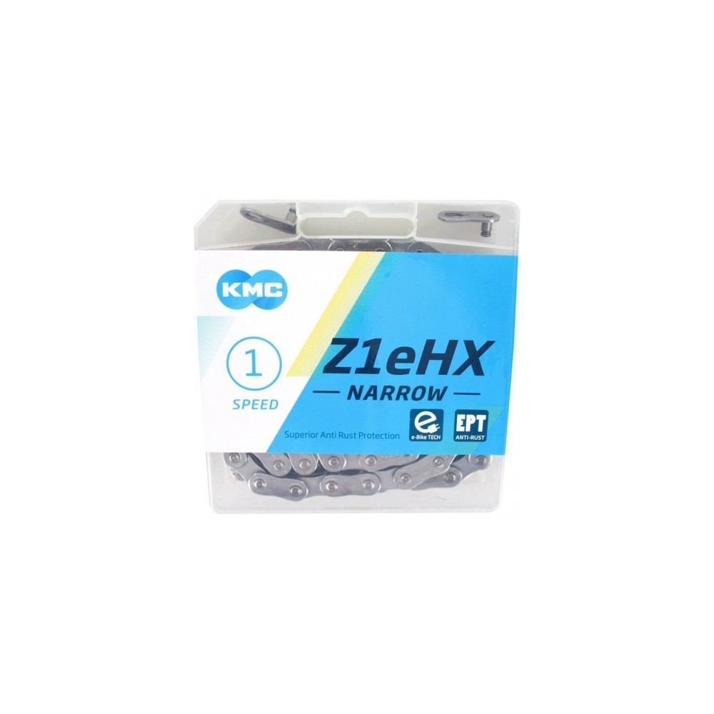 La chaîne KMC Z1eHX Silver est conçue pour VAE, BMX et singlespeed. Robuste et fiable, elle résiste aux contraintes élevées.