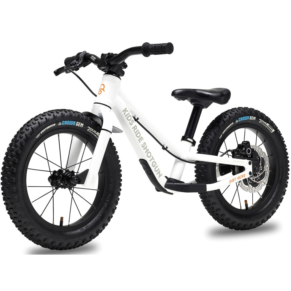 La Dirt Hero 14" de Kids Ride Shotgun est une draisienne tout-terrain conçue pour initier les enfants aux plaisirs du VTT. Équipée de pneus cramponnés Vee Tire 14", d’un cadre robuste et d’axes traversants, elle assure stabilité et contrôle sur chemins et sentiers. Prévue pour accueillir un frein à disque, elle constitue une première approche du pilotage off-road, parfaite pour développer l’équilibre et la confiance des jeunes riders.